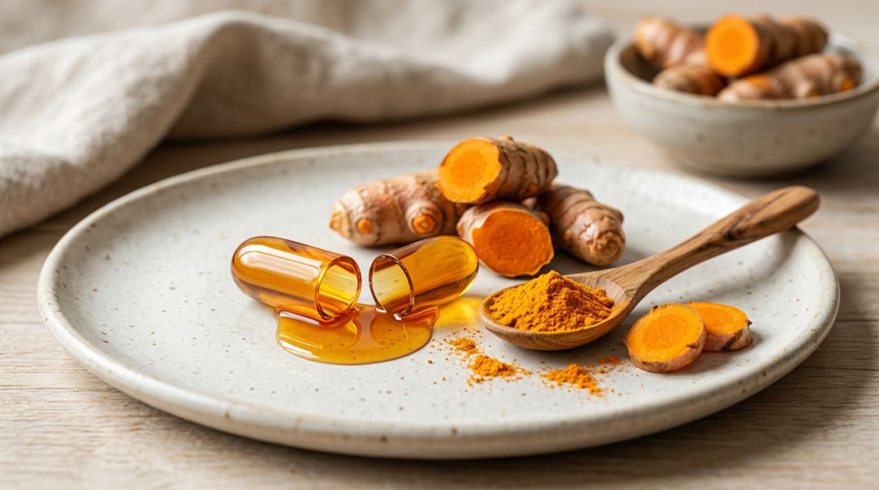 A cúrcuma, também conhecida como açafrão-da-terra, contém curcumina, seu principal composto bioativo e responsável pelos efeitos anti-inflamatórios e antioxidantes. Esse composto atua inibindo vias inflamatórias específicas, como a do NF-kB, reduzindo a produção de mediadores nocivos.