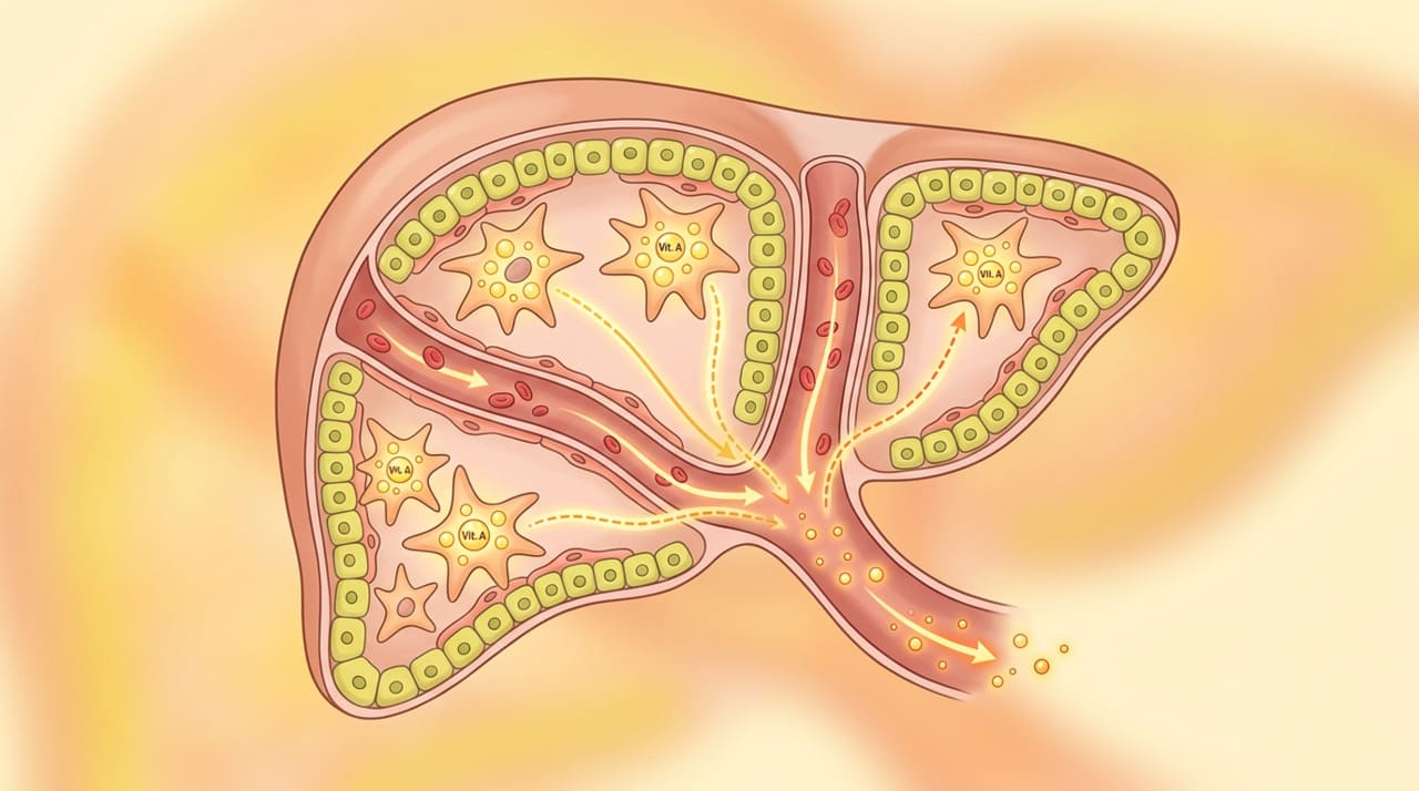 Quando o organismo precisa de vitamina A, as células estreladas convertem os ésteres de retinila de volta em retinol, que é então ligado a uma proteína transportadora chamada RBP4 e liberado na circulação para alcançar os olhos, a pele, o sistema imunológico e outros tecidos. Sem um fígado saudável, essa cadeia de armazenamento e liberação é interrompida.