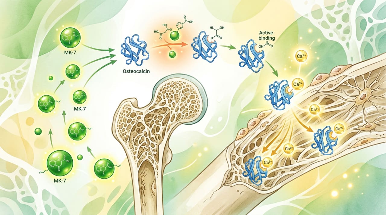 A vitamina K2 ativa uma proteína chamada osteocalcina, que funciona como um verdadeiro ímã para o cálcio, levando esse mineral diretamente para o tecido ósseo. Sem essa etapa, parte do cálcio ingerido não chega ao destino correto.