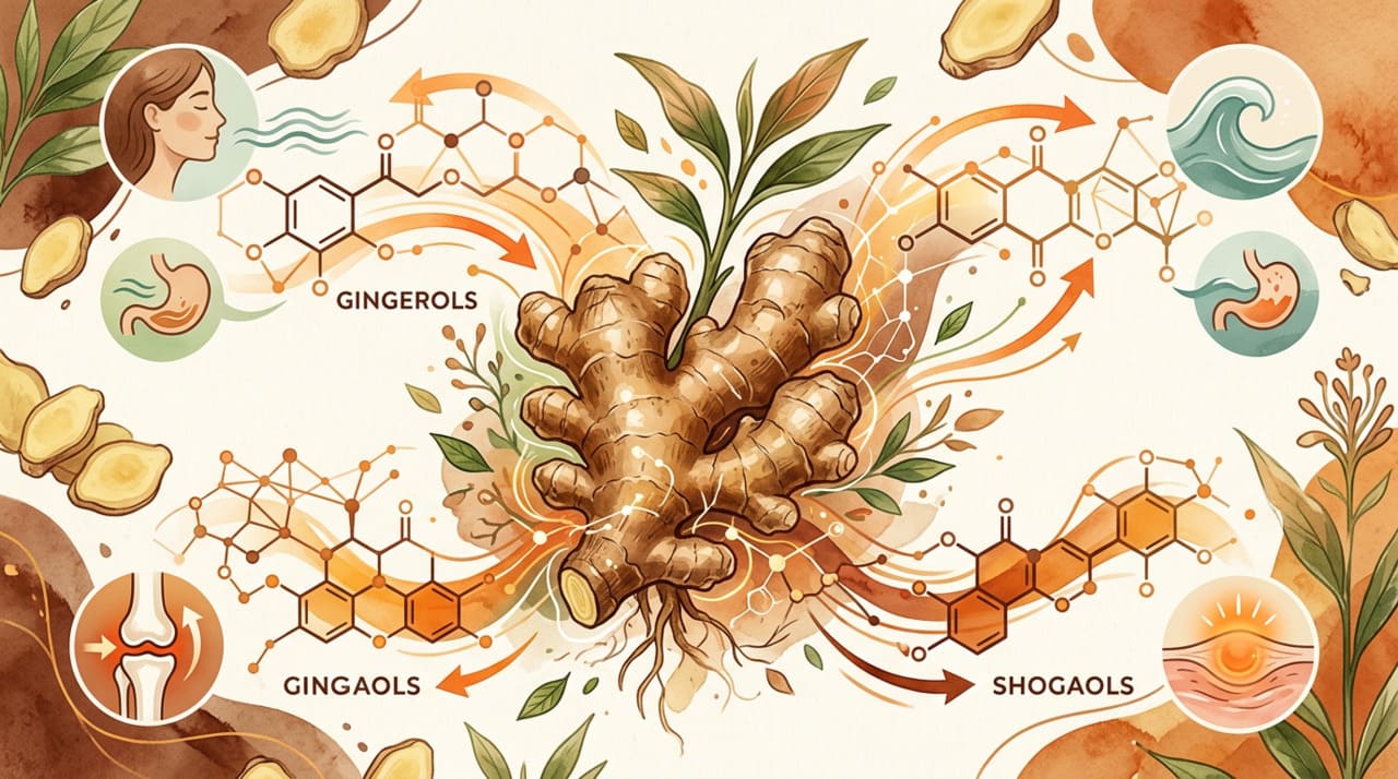 Os gingeróis são os principais compostos bioativos do gengibre fresco, enquanto os shogaóis predominam na raiz seca ou desidratada. Ambos exercem efeito antiemético ao bloquear os receptores de serotonina (5-HT3) no trato gastrointestinal, os mesmos receptores sobre os quais atuam medicamentos antieméticos utilizados em tratamentos de quimioterapia.