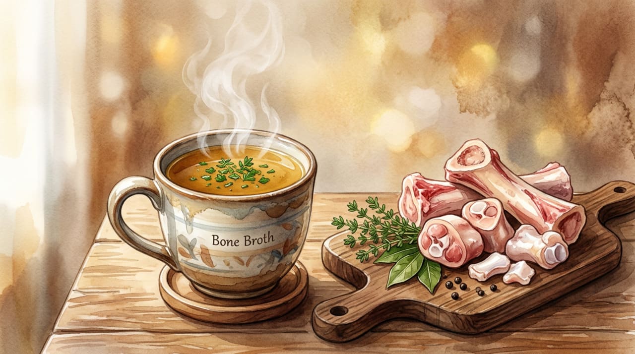 O caldo de ossos é obtido pelo cozimento prolongado de ossos e tecidos conjuntivos de animais, processo que libera colágeno, gelatina e aminoácidos como glutamina, glicina e prolina. A glutamina é o principal combustível das células que revestem a parede intestinal, chamadas enterócitos, e participa diretamente da renovação e do reparo da mucosa. Já a gelatina atrai água para o trato digestivo, lubrificando e protegendo o revestimento interno.