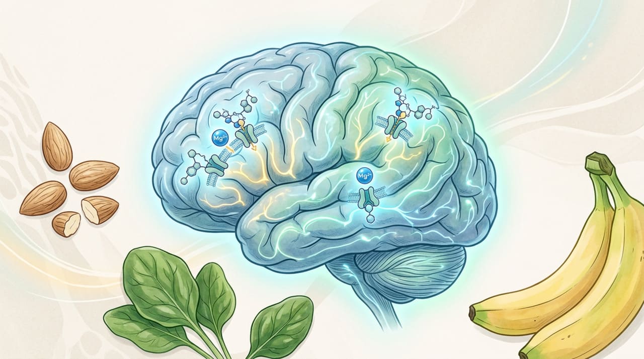 O magnésio atua como antagonista natural dos receptores NMDA e como cofator na produção de GABA, o principal neurotransmissor calmante do sistema nervoso. Isso reduz a excitabilidade neuronal e prepara o cérebro para o relaxamento.