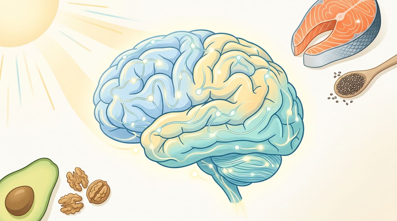 Segundo a revisão narrativa Nutritional interventions in depression the role of vitamin D and omega-3 fatty acids in neuropsychiatric health publicada na revista Clinical Nutrition, indexada no PubMed, a vitamina D modula a atividade dos neurotransmissores e reduz a neuroinflamação, enquanto o ômega-3 otimiza a transmissão serotoninérgica e estabiliza as membranas neuronais, sendo úteis como estratégias complementares no manejo de sintomas depressivos.