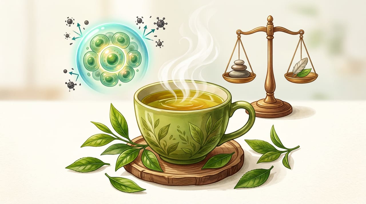 A bebida também atua como antioxidante e está associada a melhorias no perfil lipídico e na saúde cardiovascular. Entre os benefícios do chá verde mais documentados estão o suporte ao controle glicêmico e a proteção das células contra radicais livres.