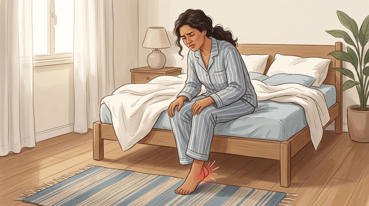A fáscia plantar é uma faixa espessa de tecido que se estende do calcanhar até a base dos dedos e ajuda a sustentar o arco do pé. Durante o sono, o pé fica relaxado e apontado para baixo, posição que encurta a fáscia e reduz sua elasticidade.