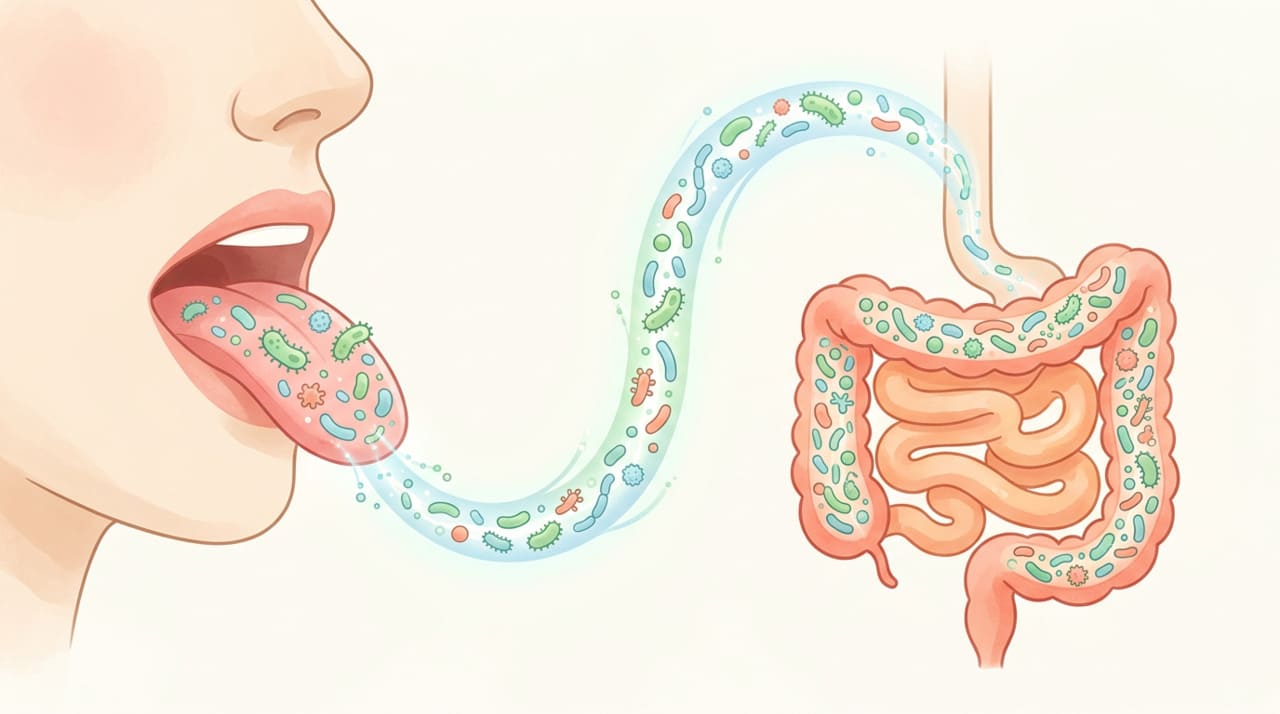 A boca e o intestino fazem parte de um mesmo eixo microbiano. Quando a microbiota intestinal perde diversidade, bactérias oportunistas se multiplicam e esse desequilíbrio se reflete também na flora oral, favorecendo o acúmulo de resíduos sobre a língua.