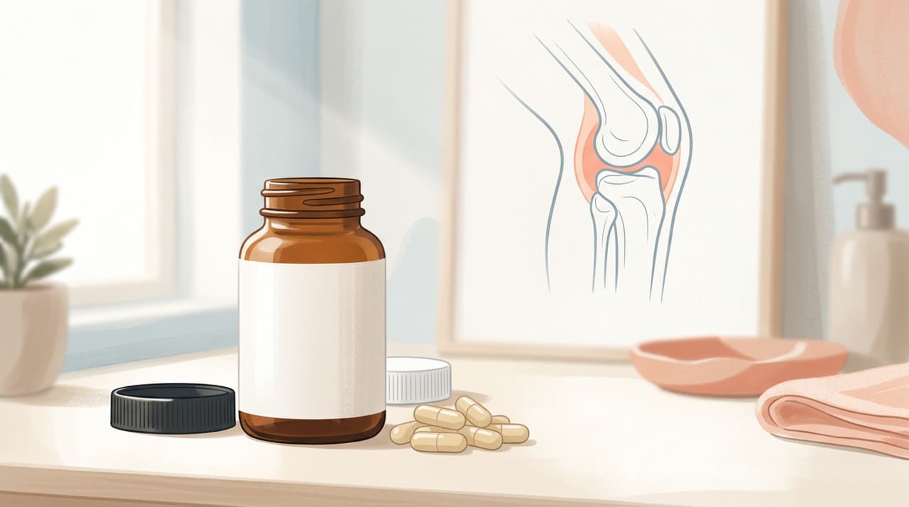 Colágeno em cápsulas ao lado de itens ligados ao cuidado articular em cena simples e realista