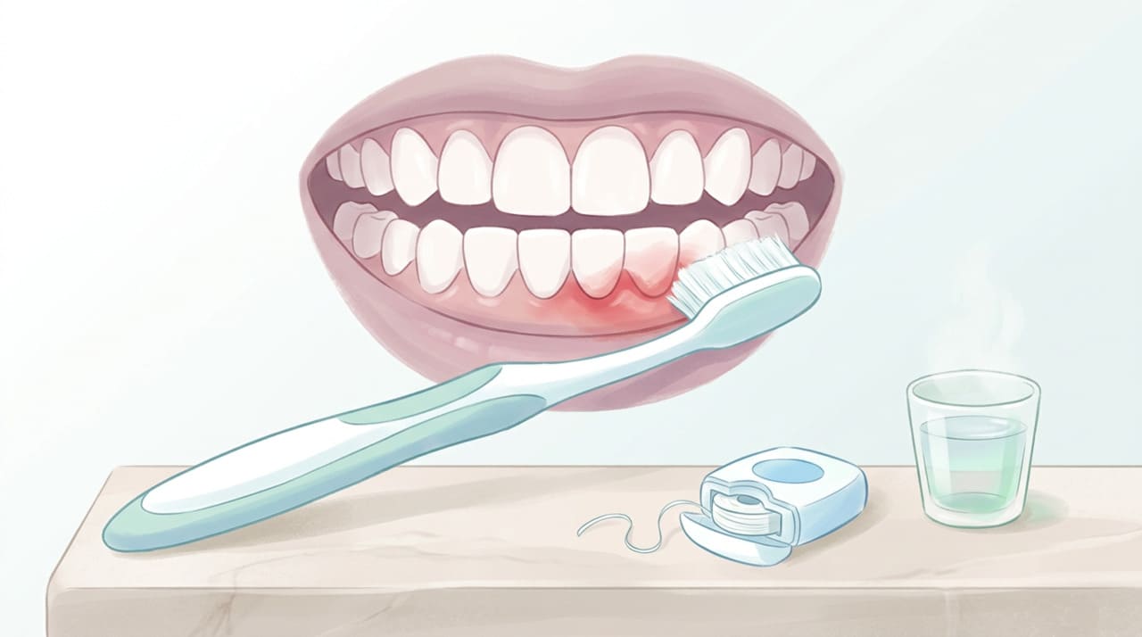 Água morna com sal, escova macia e fio dental em cena ligada ao alívio da gengiva inchada