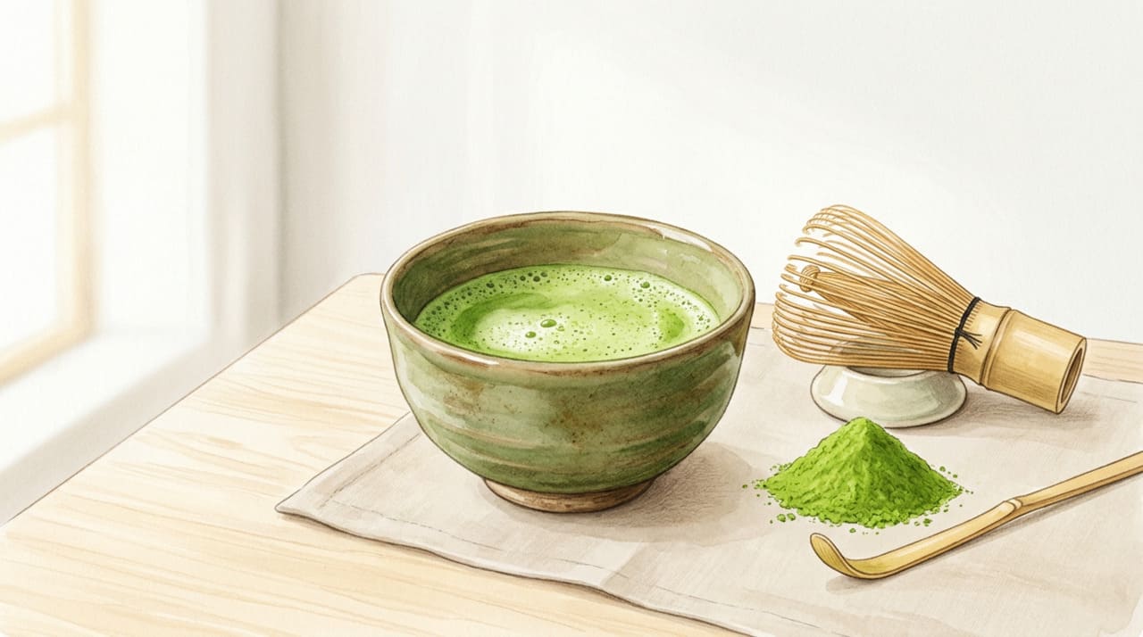 Preparação de matcha em cena que remete ao consumo gradual e ao apoio contra a inflamação.
