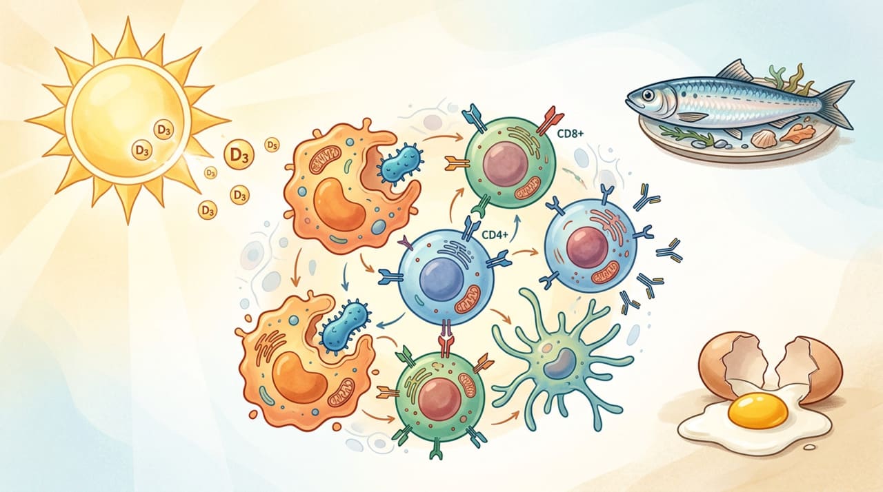 A vitamina D funciona como um hormônio no organismo. Após ser convertida em sua forma ativa (calcitriol), ela se liga a receptores presentes em praticamente todas as células do sistema imune, incluindo linfócitos T, linfócitos B e macrófagos. Essa ligação estimula a produção de peptídeos antimicrobianos, substâncias naturais que ajudam o corpo a combater vírus e bactérias logo no primeiro contato.