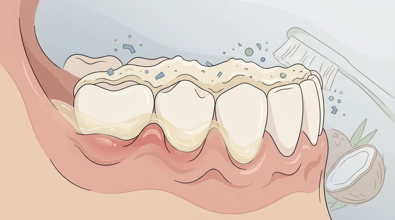 O possível efeito do óleo de coco está ligado à sua ação sobre bactérias da placa e ao contato mecânico prolongado durante o bochecho. Isso pode ajudar a diminuir resíduos e reduzir parte da irritação gengival em casos leves.