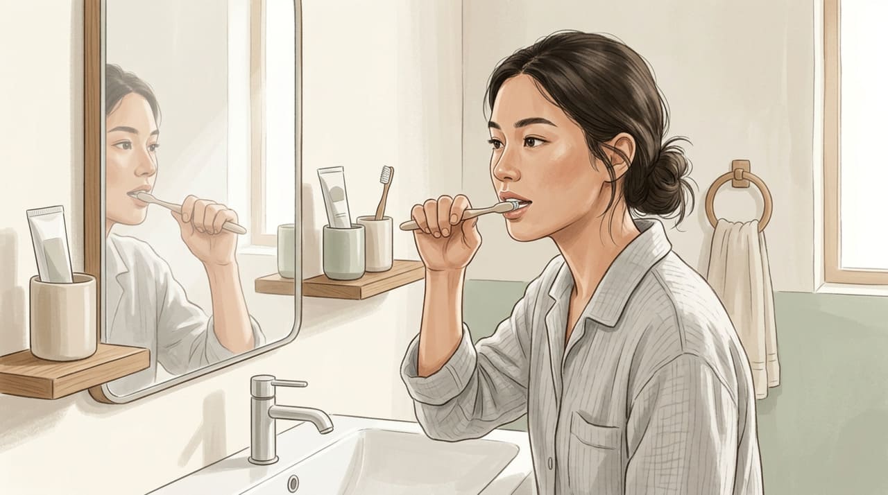 Pessoa percebe sangramento na gengiva durante a escovação e reforça o cuidado bucal.