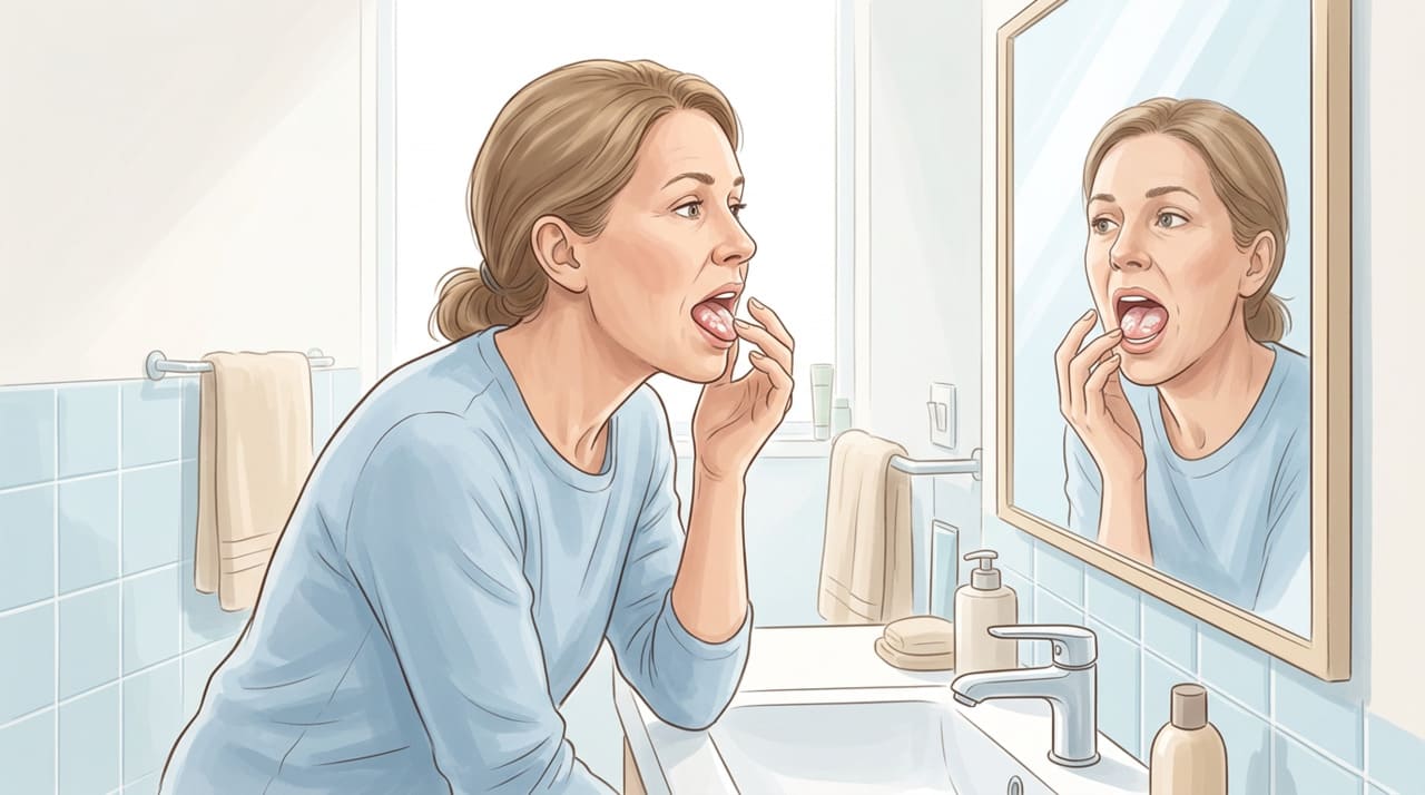 Pessoa observa sinais de candidíase oral em uma cena de cuidado precoce.