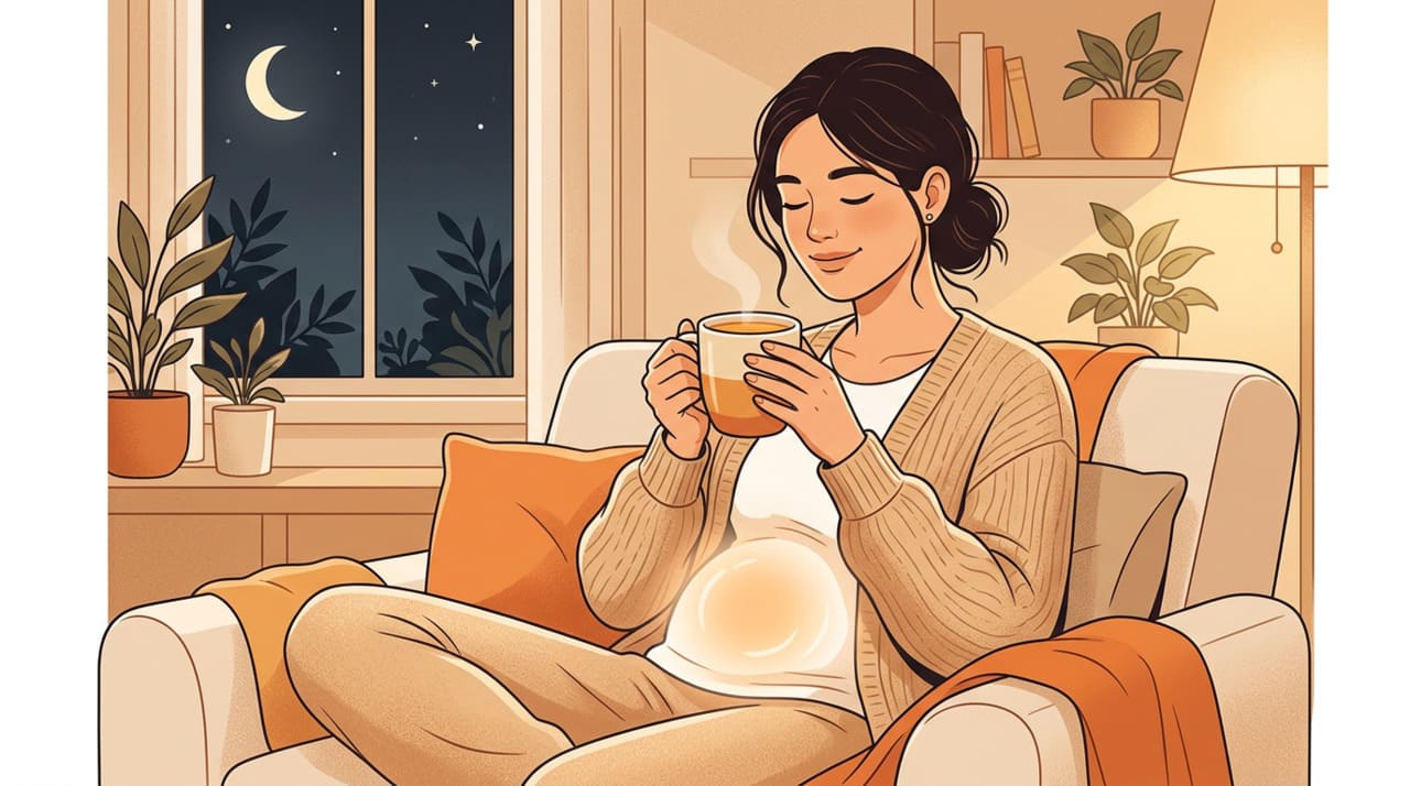 Pessoa segura chá morno de gengibre à noite em uma cena de alívio da azia.
