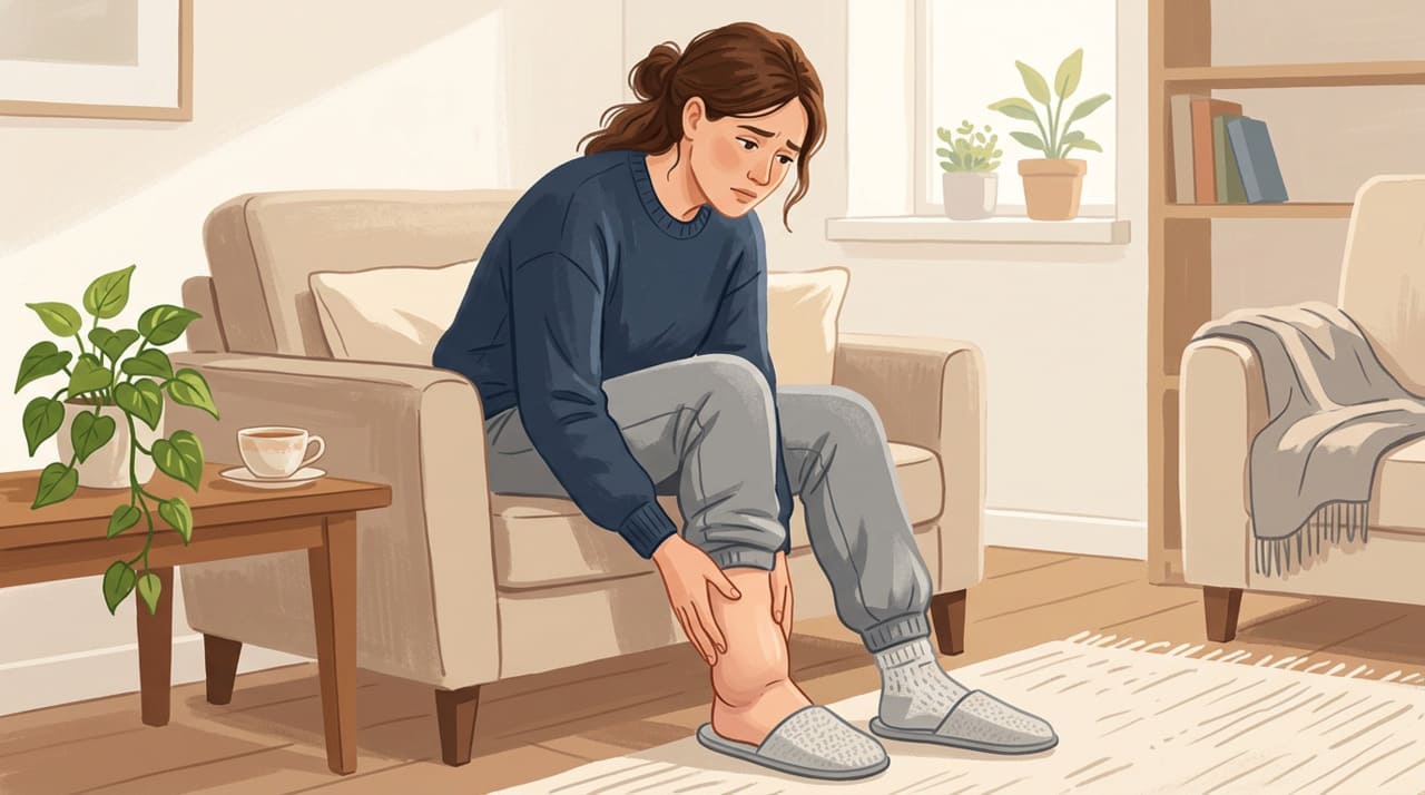 Pessoa observa inchaço no tornozelo em uma cena que representa retenção de líquidos constante.