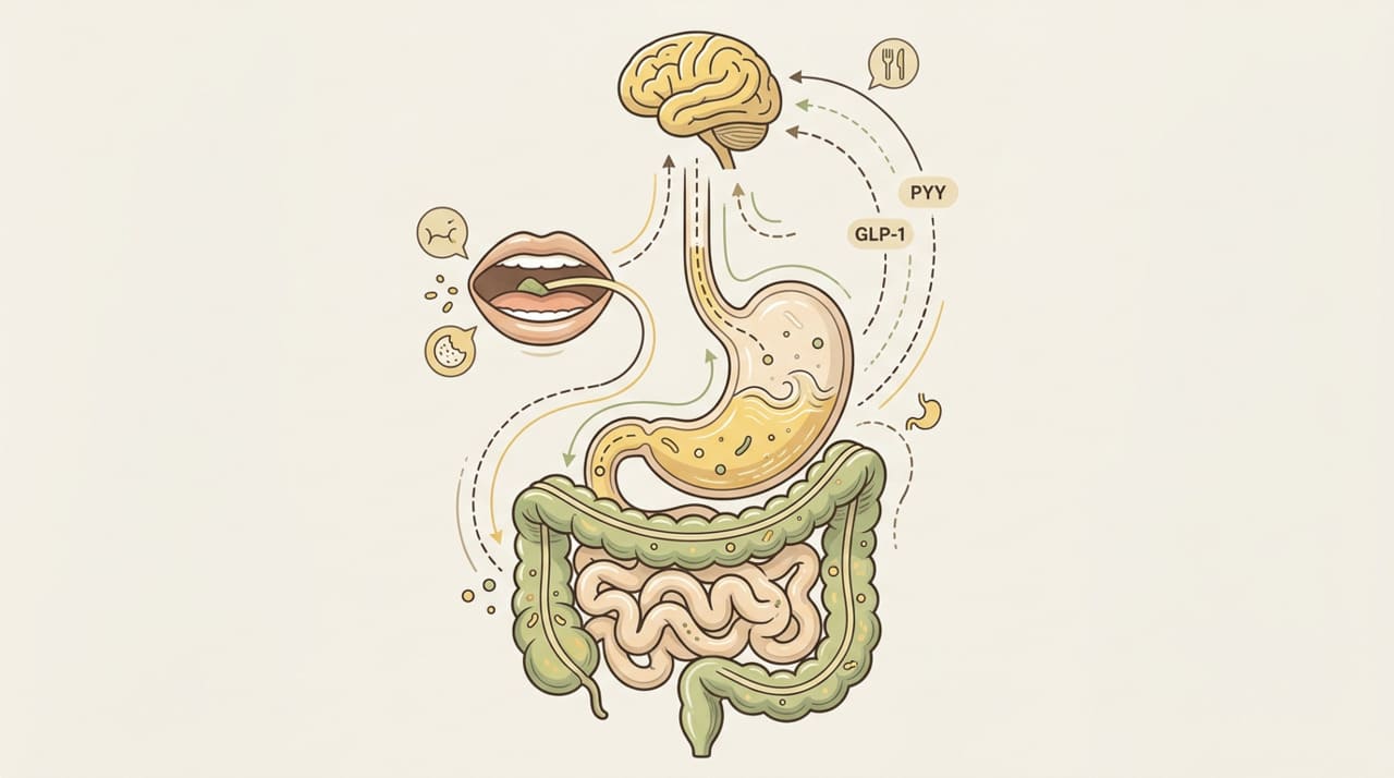 Durante a refeição, o estômago e o intestino liberam hormônios como o GLP-1 e o PYY, que informam ao cérebro quando a pessoa já comeu o suficiente. Esse processo leva em média 20 minutos, tempo necessário para que o sinal de saciedade seja realmente percebido.