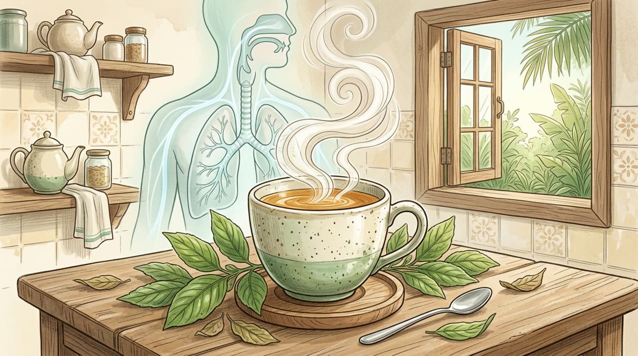 O chá promove três efeitos principais: ação expectorante, que torna o muco mais fluido; ação broncodilatadora leve, que ajuda a abrir as vias aéreas; e ação anti-inflamatória, que reduz a irritação da mucosa respiratória. O conjunto desses efeitos alivia a sensação de peito congestionado e facilita a respiração.