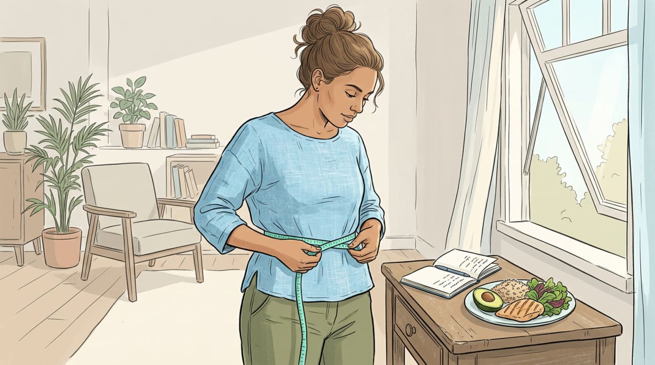Pessoa medindo a cintura ao lado de exames de glicose e triglicerídeos.