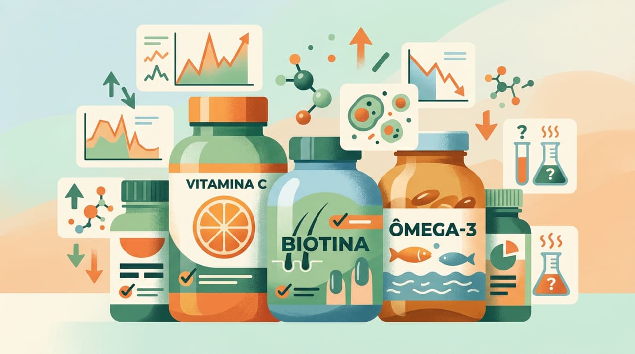 Suplementos podem produzir dois tipos principais de erro: resultados falsamente elevados, que sugerem doenças inexistentes, e resultados falsamente baixos, que escondem problemas reais. A vitamina C, por exemplo, pode reduzir artificialmente a glicose medida, enquanto a biotina pode mimetizar um quadro de hipertireoidismo ao alterar simultaneamente TSH e T4 livre.