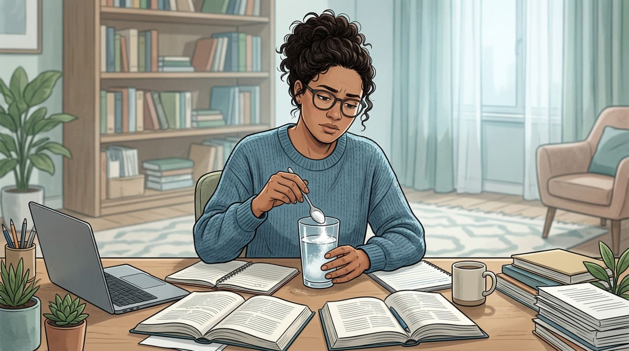 Mãos misturando creatina em água durante uma rotina de estudo.