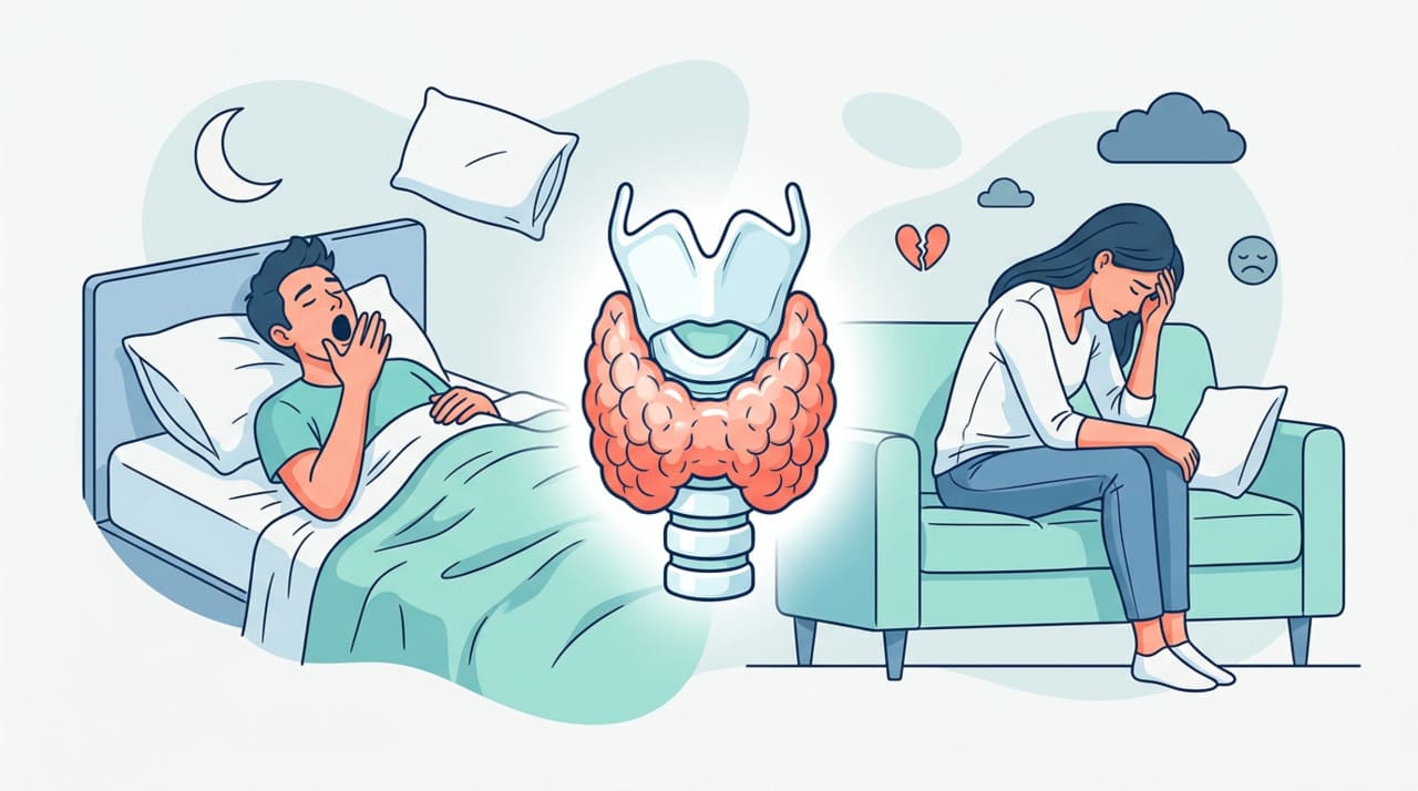 O hipotireoidismo ocorre quando a tireoide produz hormônios T3 e T4 em quantidade insuficiente, fazendo todo o metabolismo trabalhar em ritmo mais lento. A fadiga é desproporcional ao esforço, presente desde o início do dia e não melhora mesmo após noites longas de sono.