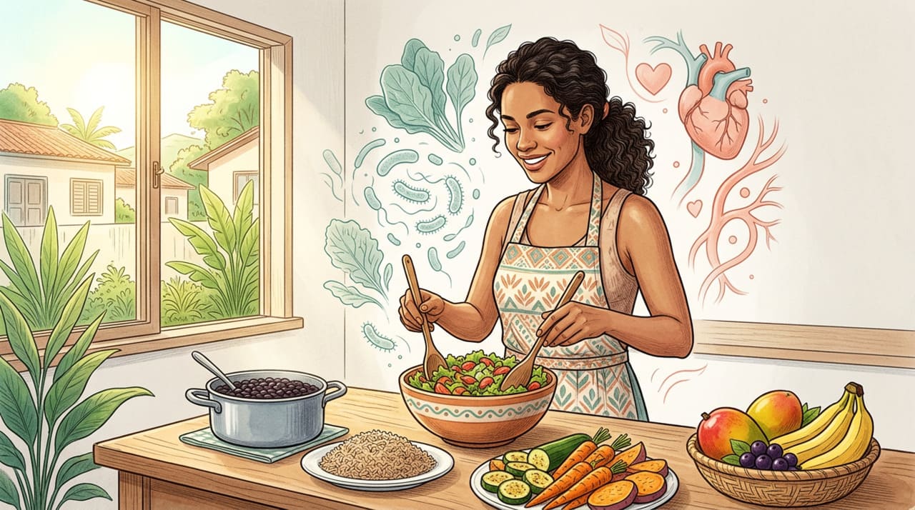 Pessoa preparando um prato rico em fibras para apoiar o microbioma intestinal.