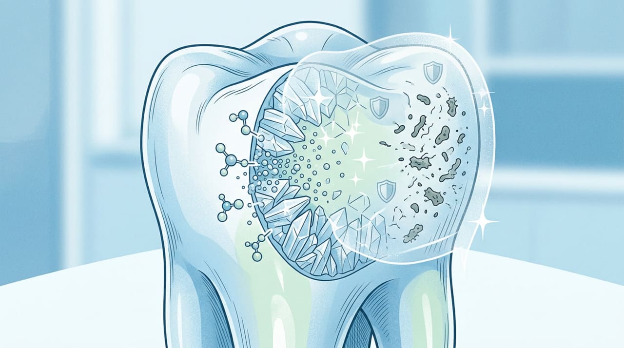O flúor atua justamente nesse equilíbrio, favorecendo a remineralização do esmalte e formando fluorapatita, uma estrutura mais resistente aos ácidos. Ele também reduz o metabolismo bacteriano da placa, dificultando a produção dos ácidos responsáveis pela cárie dentária e protegendo tanto a coroa quanto a raiz dos dentes em adultos.